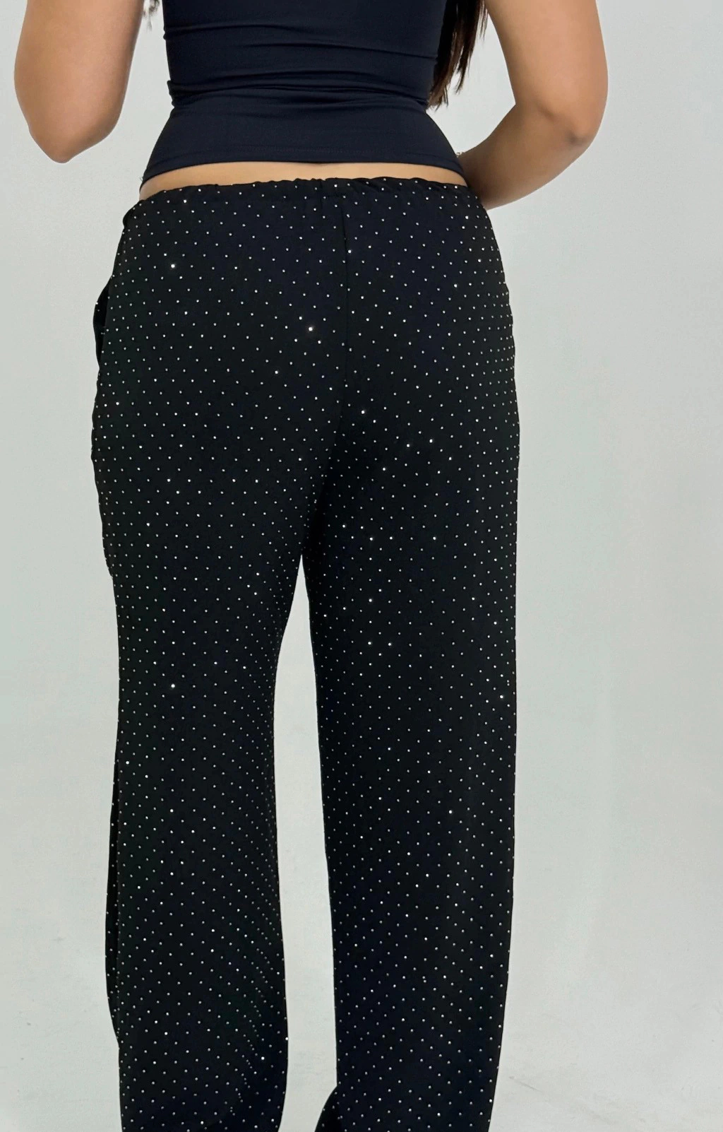 Calça despojada com pedras de brilho. Forrada na região do quadril, garantindo mais conforto e segurança ao uso. O cordão regulável permite ajustar a peça para usar mais solta ou mais justa na cintura.