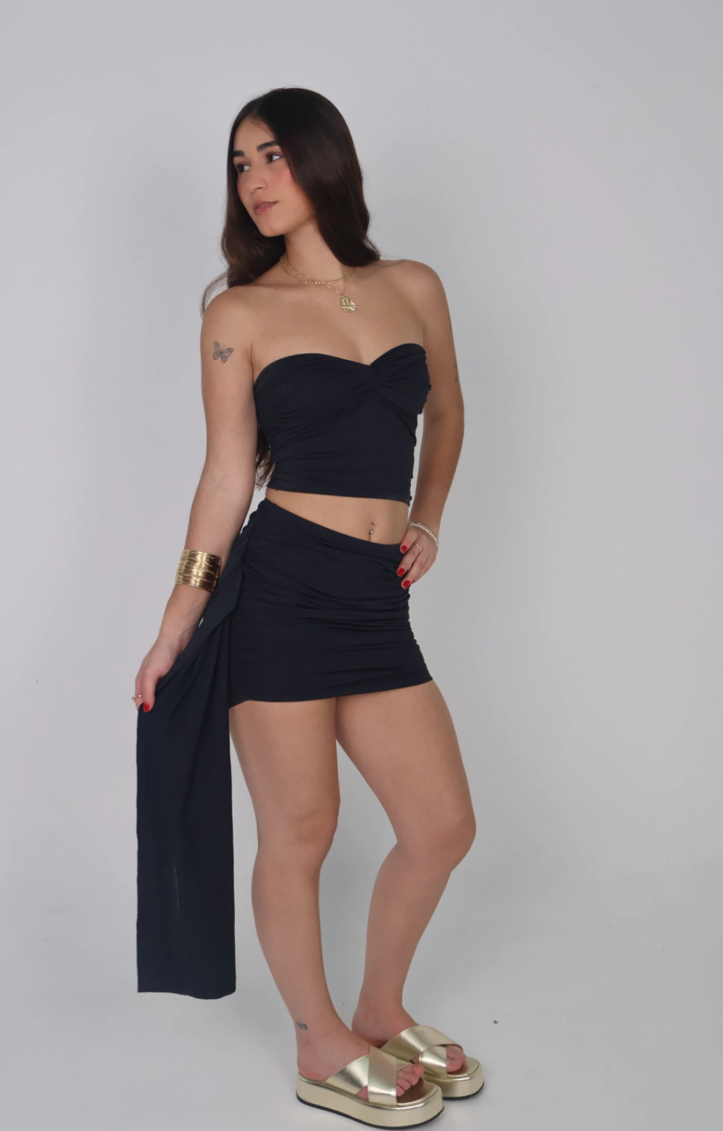 Saia curta com faixa lateral. Elástico na cintura para um melhor conforto. Modelo justo, com drapeado nas laterais que valorizam o quadril. Comprimento médio permitindo que você ajuste para deixar mais longa ou mais curta. Confeccionada em poliamida. VESTE ATÉ 42.